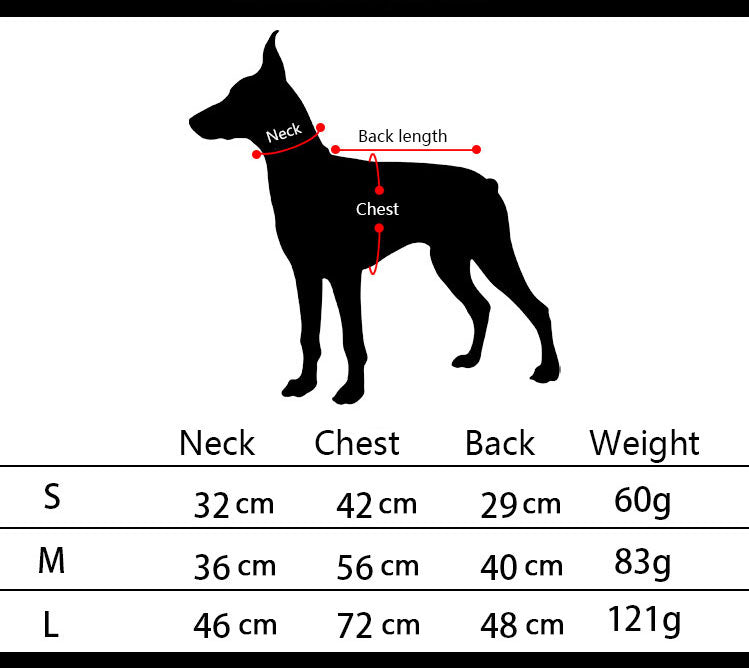 L: Neck circumference:46cm, Chest circumference:72cm, Back length:48cm.