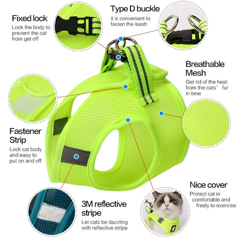 This cat harness is made of lightweight, soft, superior air-mesh material, which is not only breathable to keep your cats cool even on hot days, but also lightweight so that your pets will have no sense of restraint when wearing this harness.